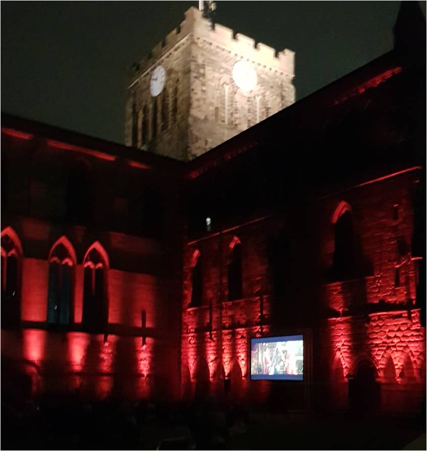 Post-corona Hexham on a Saturday night had other delights to offer. A free ‘Cinema Paradiso’-style outdoor cinema screening of The Greatest Showman was showing in the abbey garden, directly opposite the wonderfully old-school newspaper offices of the Hexham Courant and the frosted windows of the Conservative and Unionist Club.